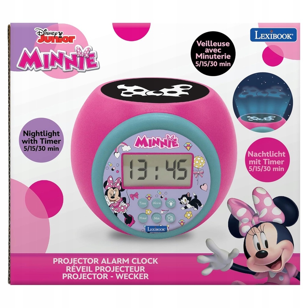 LEXIBOOK Digital Alarm Clock Minnie RL977MI to uroczy budzik dla najmłodszych, który połączy funkcję budzika z magiczną projekcją i nocnym światłem! Budzik w okrągłej formie z niebieskim podświetlanym ekranem LCD, wyświetlającym godzinę w formacie 12/24 godzinnym. Projekcja postaci Minnie na suficie w 3 kolorach: niebieskim, czerwonym i pomarańczowym, tworząca magiczną atmosferę w pokoju dziecka! Wbudowane nocne światło z automatycznym czasomierzem (5, 15, 30 minut), które wyłączy się samo po zaśnięciu dziecka.  Alarm z funkcją „snooze”, aby pozwolić na chwilę dodatkowego odpoczynku przed rozpoczęciem dnia. Zasilany przez 3 baterie LR03/AAA (brak w zestawie). Wymiary produktu: 11,8 x 11 x 9,1 cm idealny do każdego dziecięcego pokoju.Z LEXIBOOK Digital Alarm Clock Minnie RL977MI każdy poranek stanie się wyjątkowy, pełen radości i przygód z ukochaną Minnie!