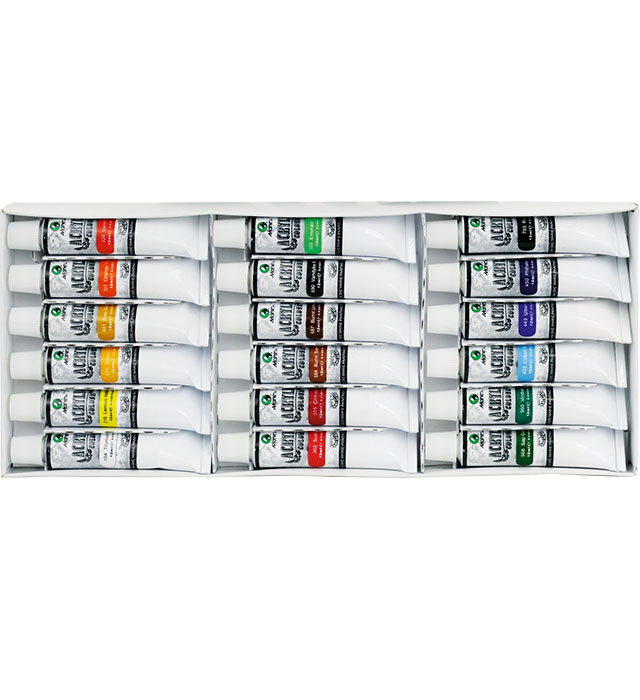 – dobrze i szybko schną, nie pękają – doskonale przepuszczają powietrze – odporne na wilgoć – odporne na blaknięcie – kolory są intensywne i trwałe – przeznaczone do malowania, pisania na papierze, drewnie, materiałach, cemencie, bambusie – po zakończonej pracy pędzle należy umyć lub zamoczyć w wodzie – pakowane w trwałe, aluminiowe tubki, chroniące przed wysychaniem i zapobiegające ulatnianiu się zapachu farb – pojemność: 12 ml – 18 kolorów