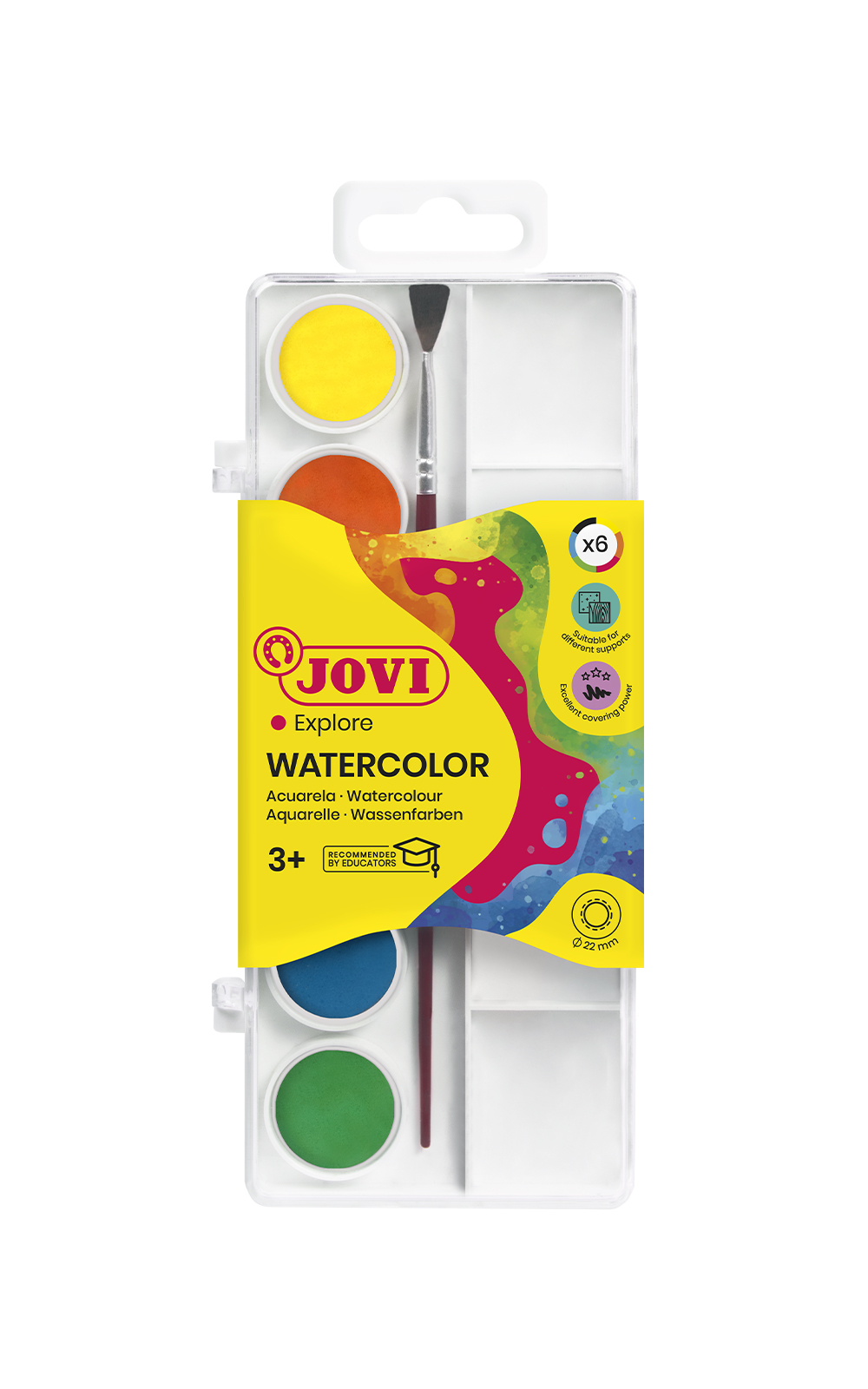 Opakowanie zawiera 6 krążków(22mm) farb akwareli, w różnych kolorach, na plastikowej tacce.