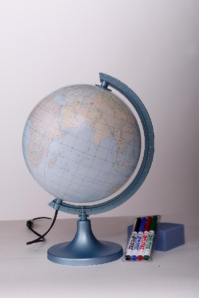 Konturowy globus 250mm podświetlany. Na kuli globusa zostały naniesione kontury kontynentów oraz granice państw, bez nazw. Na powierzchni kuli można pisac za pomocą ścieralnych flamastrów, jak na tradycyjnej bialej tablicy szkolnej. Dzięki temu globus stanowi znakomitą pomoc dydaktyczną, służąca zarówno do wprowadzania nowych pojęć, jak i utrwalania oraz sprawdzania wcześniej nabytych umiejętności. Globus ten stanowi doskonałą pomoc naukową, umożliwiającą naukę w nietypowy, ciekawy sposób.Do globusa dołączony jest komplet kolorowych flamastrów oraz gąbka.