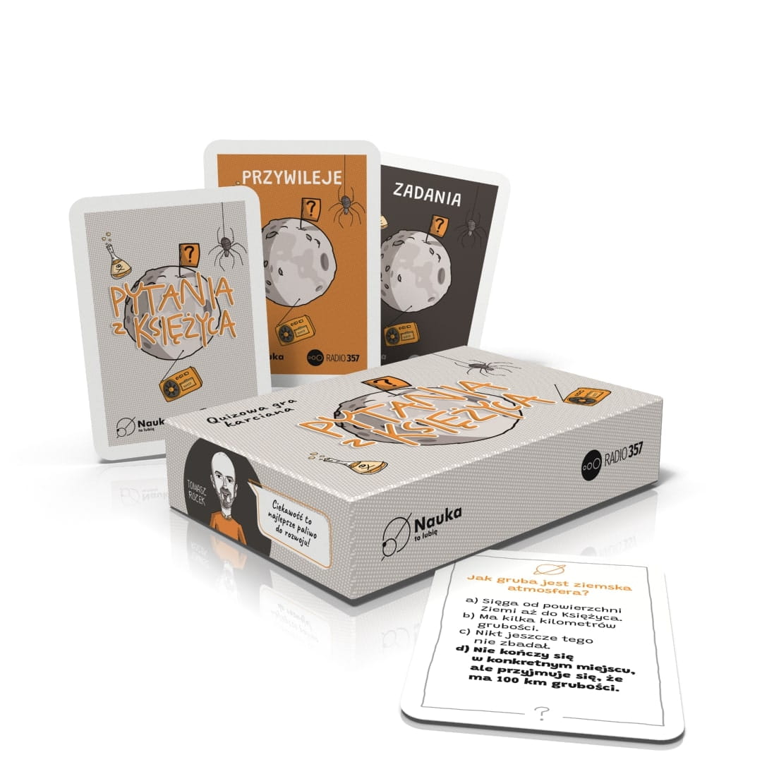 „Pytania z księżyca” to przede wszystkim gra familijna, która wprowadzi element rozrywki i zabawy w codzienną rutynę. Karty z pytaniami ucieszą szczególnie słuchaczy audycji Radia 357: „Pytania z Księżyca”, na podstawie której powstała gra oraz towarzysząca jej książka. W talii kart znalazły się intrygujące i nietypowe pytania z takich dziedzin, jak kosmos, świat przyrody, człowiek oraz cywilizacja. Tak szeroki przekrój tematów sprawia, że jest to gra, która sprawi przyjemność zdobywania wiedzy wszystkim członkom rodziny, niezależnie od rodzaju upodobań i zainteresowań.