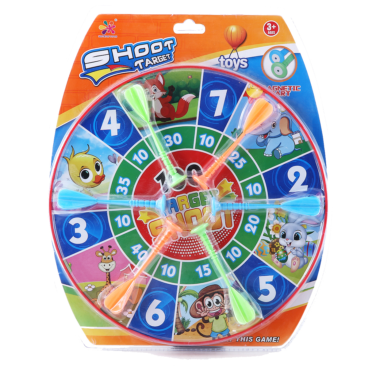 Bezpieczna wersja popularnej gry towarzyskiej z dziecięcą grafiką. Tarcza ma 30 cm średnicy i w zestawie z nią znajduje sie 6 rzutek w 3 różnych kolorach.Rzutki są zakończone magnesem, który mocno trzyma się tarczy po trafieniu.Dzieci mogą bawić się w pojedynkę lub w większej grupe,urządzając zawody w rzucaniu.Rzuty do celu to zdrowa rywalizacja. Bezpieczna zabawa zarówno w pomieszczeniu,jak i na dworzu. Rzutki nie mają ostrych elementów.Wymiary produktu: wys. 38 cm. dł. 5 cm. szer. 32,5 cmWiek: 3+
