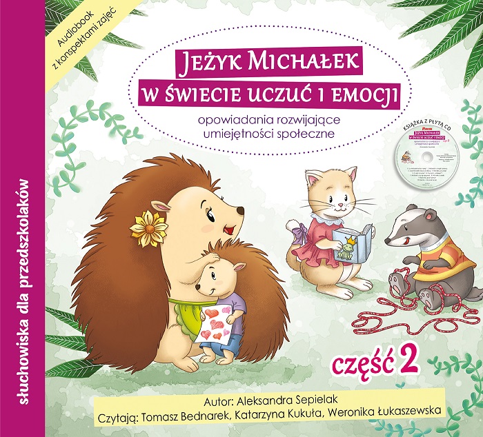 Przedstawiamy zbiór 10 opowiadań, które sprzyjają rozwijaniu umiejętności społecznych u dzieci. Słuchowiska kształtują dziecięcą wyobraźnię oraz pozytywnie wpływają na koncentrację. Wymagają od małych słuchaczy skupienia uwagi, przez co doskonalą percepcję słuchową, a także wyciszają i uspokajają. Opowiadania rozwijają również kompetencje emocjonalne, społeczne i kulturowe dzieci, a także wzbogacają ich słownictwo. Słuchając audiobooków i śledząc kolejność następujących po sobie zdarzeń, przedszkolaki wczuwają się w sytuacje bohaterów i ćwiczą empatię. Jest to kontynuacja przygód Jeżyka Michałka. Słuchając albumu, dzieci – wraz z Michałkiem – poznają lepiej takie uczucia i emocje, jak miłość, tęsknota, złość, zniecierpliwienie czy strach. Zaczynają rozumieć, skąd się one biorą, jak je rozpoznawać i jak sobie z nimi radzić. W drugiej części albumu, dzięki innowacyjnym opowiadaniom z alternatywnymi zakończeniami, dzieci dowiadują się: dlaczego nie warto odpowiadać przemocą na przemoc, jak zachowuje się prawdziwy zwycięzca, po co są zasady, jak wyrażać swoje zdanie i jak pocieszać osoby, które tego potrzebują. W skład publikacji wchodzą: • płyta CD z audiobookami opowiadań (5 klasycznych oraz 5 innowacyjnych opowiadań z alternatywnymi zakończeniami!) • książka z tekstami opowiadań i konspektami zajęć • dostęp do wersji streamingowej audiobooka. W spis treści książki zostały wplecione krótkie streszczenia – ma to na celu ułatwienie oceny, czy dane opowiadanie spełnia założone przez nauczyciela cele dydaktyczne i będzie przydatne w toku zaplanowanej tematyki zajęć. Opowiadaniom towarzyszą konspekty – jest to zbiór zagadnień ułatwiających przeprowadzenie zajęć o zadanej tematyce w oparciu o dane słuchowisko. Nauczyciel znajdzie tam: • opis celów edukacyjnych, które można zrealizować za pomocą słuchowiska • zakres obszarów podstawy programowej wychowania przedszkolnego, przy realizacji których pomocne będzie opowiadanie • przykładowe pytania do rozmowy prowadzonej z dziećmi na podstawie słuchowiska • inspiracje do zabaw, które może przeprowadzić nauczyciel z dziećmi po wysłuchaniu opowiadania • wskazówki dla nauczyciela pomocne w realizacji zajęć zorganizowanych na podstawie słuchowiska.