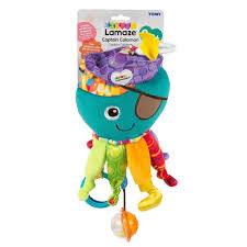 Wesoła zawieszka Kapitan Calamari to doskonały towarzysz pierwszych zabaw Twojego dziecka! Zabawka wykonana z miękkiego materiału.Co drugie ramię ośmiornicy i kapelusz posiadają szeleszczące elementy, a od spodu zamontowane bezpieczne lustereczko. Dodatkowe elementy przyczepione do macek ośmiornicy to grzechotka z kolorowymi koralikami oraz kółka pełniące funkcję gryzaczka.Razem z Lamaze pobudź wyobraźnię dziecka i jego zmysły, zainteresuj je wspaniałą zabawą, która pomoże w prawidłowym rozwoju! Jasne, żywe kolory i kontrastujące wzory zachęcają dziecko do skupienia wzroku, a miękkie materiały i różne tekstury stymulują zmysł dotyku. Wygodny uchwyt umieszczony w zabawce pozwoli na zabranie jej ze sobą, umieszczenie w dowolnie wybranym przez nas miejscu.