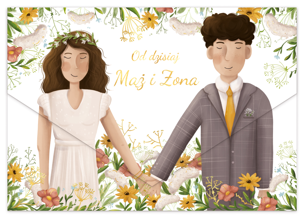 Karnet z kieszonką na pieniędze w formacie A5, składany z trzech. Złocony i tłoczony, teksy życzeń w środku. Wydrukowany na wysokiej jakości papierze. W zestawie koperta.
