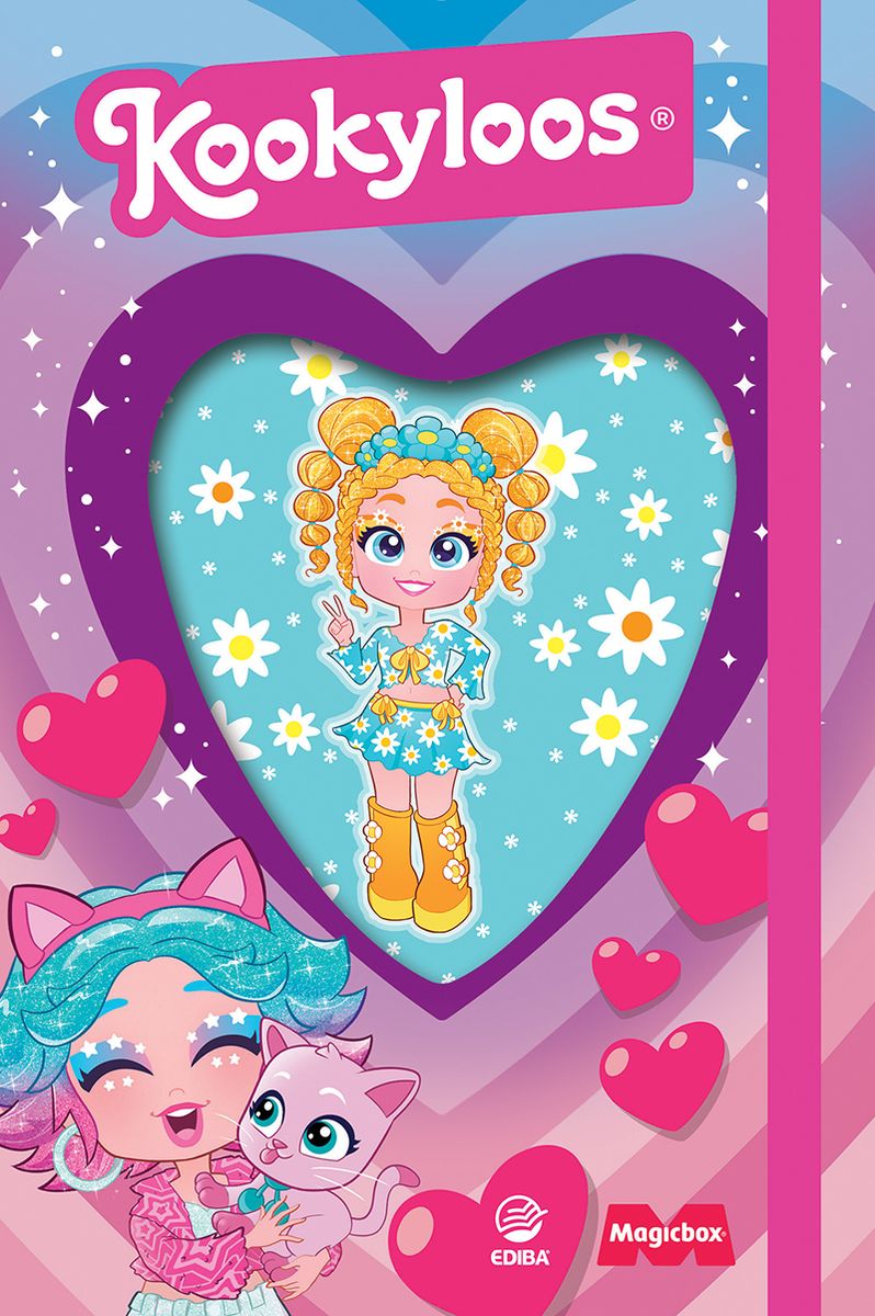 Książka aktywnościowa dla dziewczynek do zabawy osobno lub z lalką Kookyloos. Treść daje możliwość uzupełniania i kolorowania rysunków oraz poznawania laleczek z kolekcji zabawek. Otwór w kształcie serca w okładce i w stronach pozwala na ułożenie w nim lalki i przekręcanie stron w trakcie zabawy bez usuwania lalki. Karty z postaciami 8 laleczek na końcu książki dają możliwość zmiany wizerunku lalki w otworze na okładce.