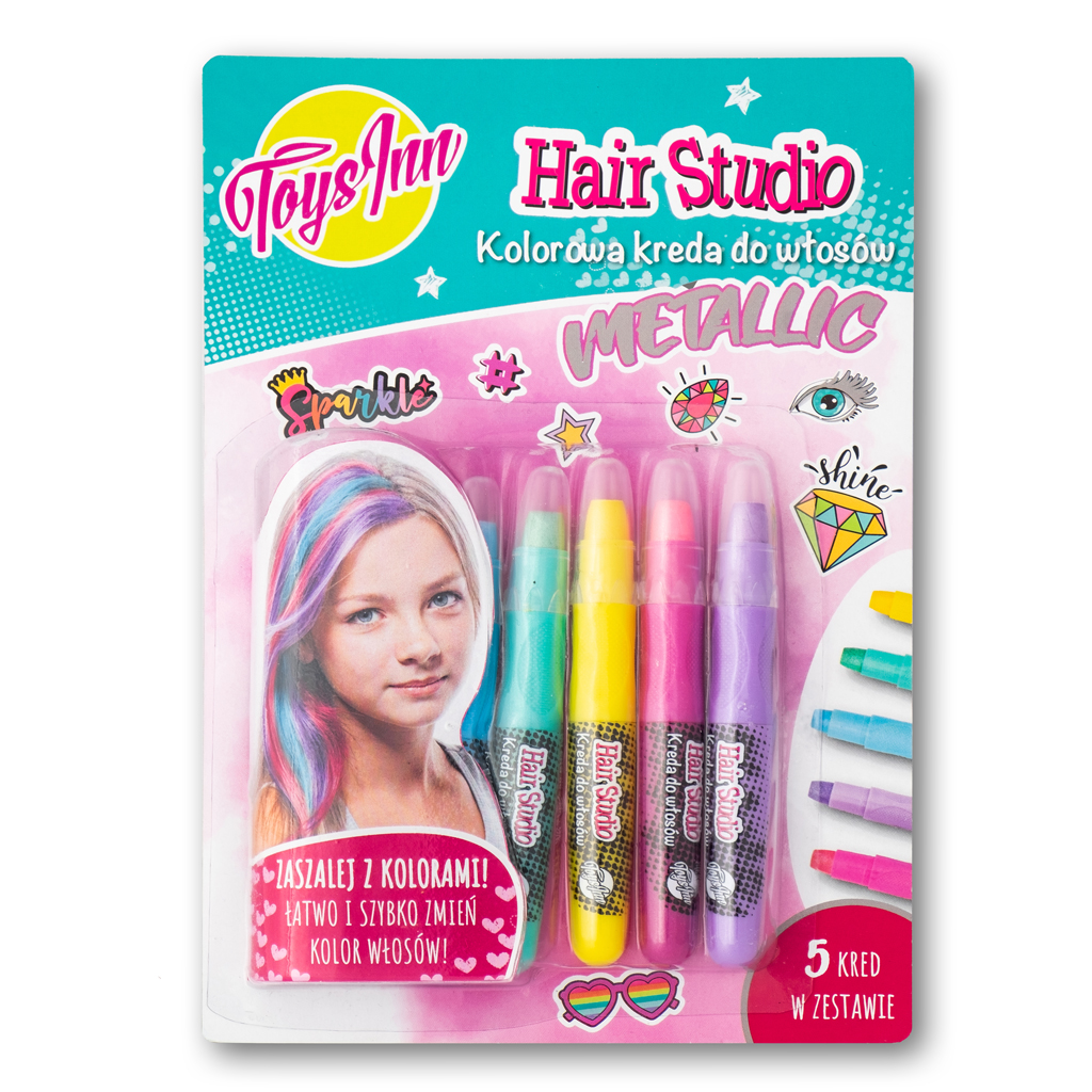 Hair studio Metallic – to kolorowa kreda do włosów o metalicznych odcieniach. Zaszalej z kolorami! Łatwo i szybko zmień kolor włosów. Zestaw zawiera pięć kred w kolorach: metaliczny niebieski, metaliczny zielony, metaliczny żółty, metaliczny różowy i metaliczny fioletowy. W celu usunięcia kolorów z włosów wystarczy umyć je szamponem.