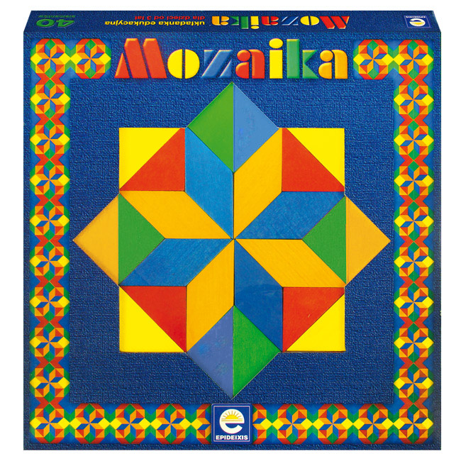 Mozaika w ozdobnym pudełkuto 40 drewnianych klocków w kształcie trójkątów i rombów w kolorach: czerwonym, zielonym, niebieskim, żółtym i pomarańczowym. Do kompletu opracowana została książeczka z serią czterdziestu ośmiu wzorów o wzrastającym stopniu trudności z przemyślaną kombinacją kolorów.