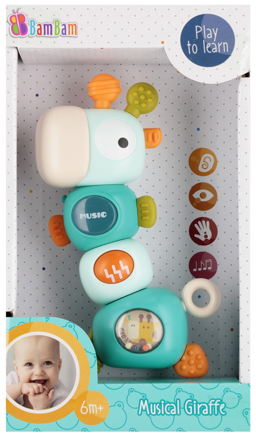 Muzyczna Żyrafka BAM BAM. Kolorowa Muzyczna Żyrafka to radosna zabawka, która łączy dźwięki, światła i ruch, dostarczając dziecku mnóstwo frajdy. Dzięki interaktywnym funkcjom maluch poznaje pierwsze melodie, rozwija poczucie rytmu i odkrywa świat muzyki poprzez zabawę. Zabawka wspiera rozwój słuchu i poczucie rytmu, zachęca do ruchu i tańca, rozwija koordynację ręka oko, pobudza ciekawość i wyobraźnię, uczy przyczynowo skutkowego myślenia ( dźwięk/światło). Cechy produktu: przyjazny kształt i kolorowy design żyrafki, różnorodne melodie i efekty dźwiękowe, bezpieczne, solidne materiały,intuicyjna obsługa dostosowana do najmłodszych. Muzyczna Żyrafka to doskonały towarzysz zabawy łączy naukę z rozrywką i wywołuje uśmiech na twarzy każdego malucha. Wymiary produktu (dł. x wys. x gł.)cm: 11x22x6, wymiary opakowania (dł. x wys. x gł.)cm: 16x27x7,  wymaga zasilania bateriami- 2x AALR06 -załączonymi do zestawu.Zabawka przeznaczona dla dzieci w wieku: 6m+. Pakowana w kartonik z okienkiem.