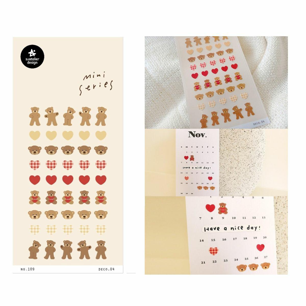 Naklejki MINI Pluszowy Miś koreańskiej marki Suatelier. Piękne i oryginalne mini naklejki samoprzylepne, które mogą być używane do ozdabiania notesów, kalendarzy, planerów, telefonów, kartek i wielu innych produktów. Szeroka gama motywów, od prostych i eleganckich do bardziej fantazyjnych i kolorowych pozwala na dopasowanie naklejki do indywidualnego stylu i gustu, nadając osobisty akcent oraz unikalność. Wykonane z wysokiej jakości materiałów oraz drukowane za pomocą nowoczesnych technologii, aby zapewnić trwałość i żywe kolory.Naklejki wykonane z papieru. Wymiar arkusza 7×15 cm.