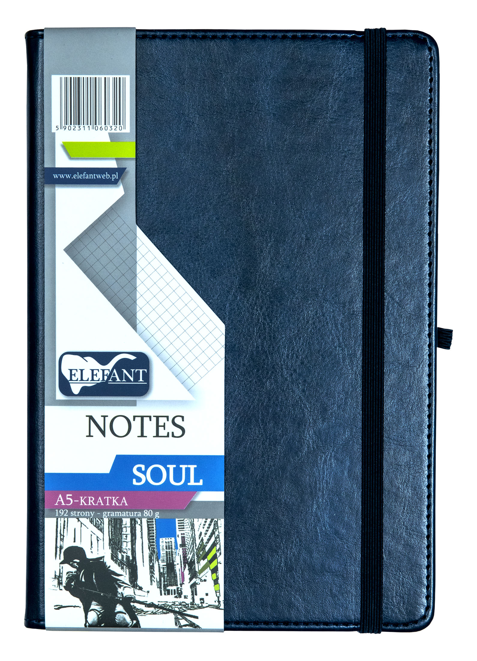 Notes wykonany jest z wysokiej jakości materiału, występuje w formacie A5 o wymiarach (210×145 mm).Notes posiada: elastyczną gumkę na długopis, kopertę w kolorze czarnym z wytrzymałego papieru, gumkę spinającą cały notes, twardą oprawę z możliwością grawerowania lub tłoczenia loga, zaokrąglone rogi oprawy,192 strony w kratkę, występuje w kolorze granatowym z granatową gumką, notes przeszyty jest delikatną nicą w kolorze granatowym.
