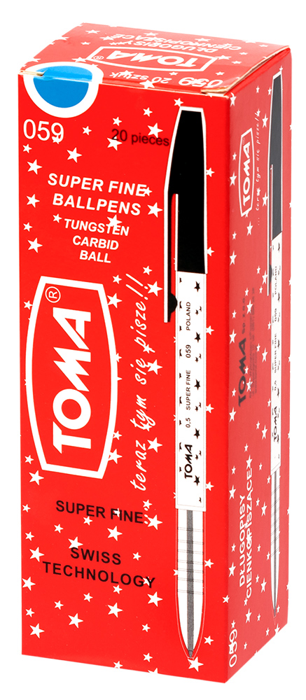 Długopisy SUPERFINE TO-059 Długopisy w plastikowej obudowie w gwiazdki w kolorze tuszu, trwała kulka z węglików spiekanych wolframu 0,5 mm, istnieje możliwość zaopatrzenia we wkłady wymienne w opakowania po 50 szt. Wentylowana nasadka z wytłoczonym logo TOMA. WKŁAD – szwajcarska technologia Floating BallSystem