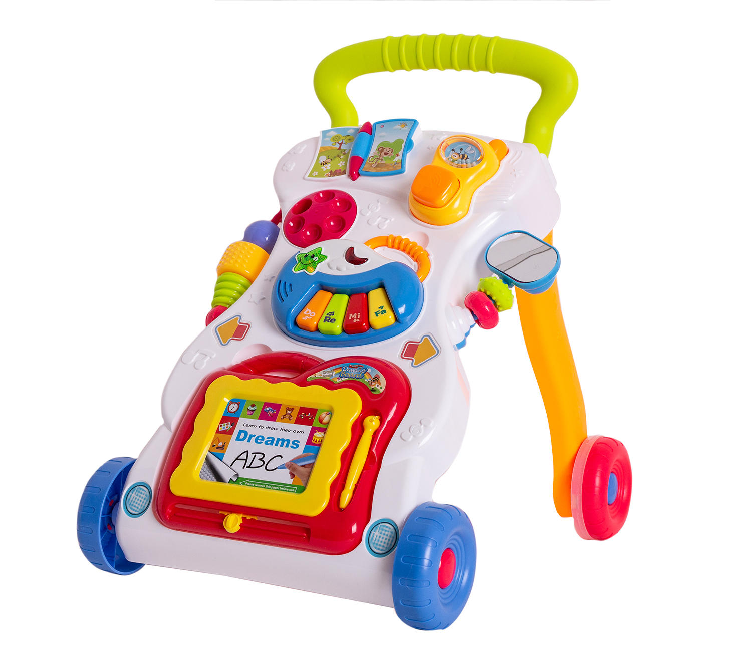 Interaktywny pchacz, który wyposażony jest w panel edukacyjny, tworzący prawdziwe mobilne centrum zabaw z dźwiękami i światełkiem.Pchacz to miejsce do zabawy także dla dziecka, które jeszcze nie chodzi i może bawić się w pozycji siedzącej.Pchacz pomaga przy stawianiu pierwszych kroków dziecka, ale jest też miejscem do zabawy.