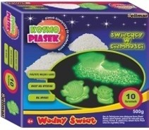 Kosmo Piasek to biały świecący w ciemności piasek kinetyczny o wadze 500g, wraz z foremkami w kształtach zwierzątek.