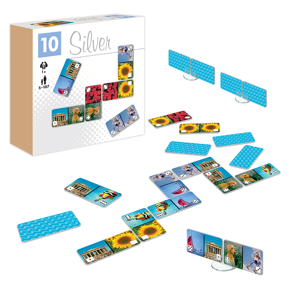 „Domino” Silver to seria klasycznych gier składających się z prostokątnych tabliczek, przedzielonych na pół za pomocą różnej grafiki. Zabawa polega na właściwym dopasowaniu elementów prezentujących ten sam obrazek. Wygrywa w niej ten, kto pierwszy pozbędzie się swoich tabliczek, przez dokładanie ich do odpowiedników leżących na stole. Większy niż standardowo rozmiar tabliczek ułatwia chwytanie. 1. Stymulacja funkcji poznawczych poprzez aktywację pamięci operacyjnej.2. Wspieranie motoryki małej.3. Terapia dłoni.4. Wspomaganie neuroplastyczności u osób starszych.5. Poprawa lateralizacji i integracji międzypółkulowej.6. Ćwiczenie percepcji wzrokowej.7. Wspomaganie orientacji przestrzennej. 8. Ćwiczenia dla osób z demencją oraz deficytami poznawczymi.9. Wsparcie w terapii osób po udarach i cierpiących na chorobę Parkinsona.10. Trening funkcji wykonawczych, poprzez strategiczne planowanie ruchów, co jest szczególnie korzystne dla osób z zaburzeniami uwagi oraz po urazach mózgu.