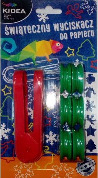 Świąteczny wyciskacz do papieru Kidea – opis produktu:Zawartość zestawu:6 wymiennych różnych wzorów 15mmdo papieru powyżej 160gwygodny w użyciuWyciskaczem do papieru przyozdobisz ręcznie robione kartki świąteczne.Wiek 6+