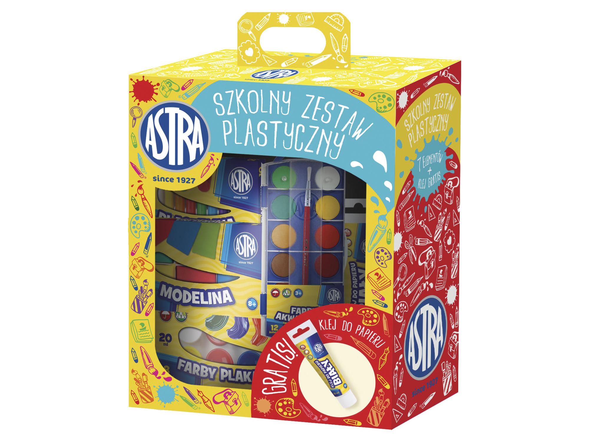 Skład zestawu: farby akwarelowe 12 kolorów, farby plakatowe 8 kol. 10 ml, plastelina 10 kolorów, plastelina fluorescencyjna 6 kolorów, modelina 6 kolorów, kubeczek z blokadą wylania, pędzle szkolne rozmiar 2,6,12. Klej biały tuba 35 ml – gratis!