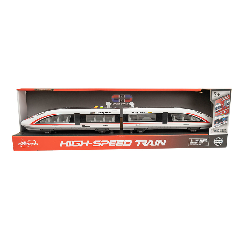 Szybka kolejka Wagony łączone na magnez, w momencie podłączenia wagoników włączają się światła 4 dźwięki – jazdy pociągu, alarmowy, dźwięk zatrzymynia, sygnał ciągły, otwierane drzwi Wymiary kolejki 57 x 5.5 x 7 cmWymiary opakowania: 59 x 10 x 17 cmZasilanie: 6xAG13 (dołączone) Wiek 3+