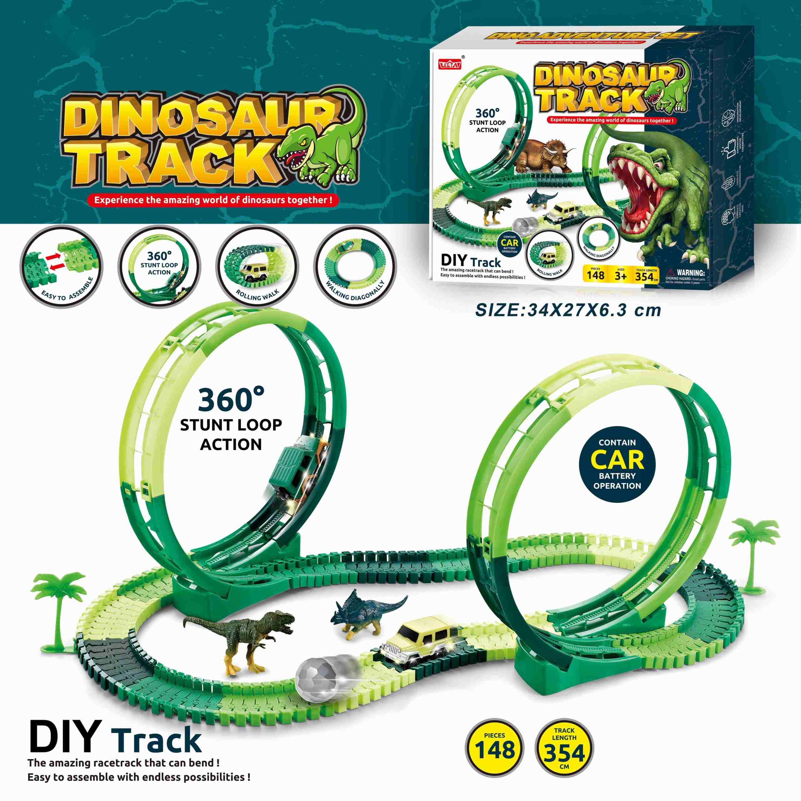 Dinosaur Track tor wyścigowy z pętlami i dinozaurami (148 elementów) to wyjątkowa zabawka dla małych miłośników przygód i prehistorycznego świata! Elastyczny tor o długości aż 354 cm można dowolnie wyginać i układać, tworząc zaskakujące trasy z zakrętami, pętlami i przeszkodami. W zestawie znajduje się samochodzik terenowy, realistyczne figurki dinozaurów, palma, ruchomy mostek oraz efektowna kula do zderzeń. Całość uzupełniają dwie pętle 360°, które zapewniają emocjonującą jazdę i mnóstwo frajdy. Idealny do samodzielnego montażu – rozwija wyobraźnię, kreatywność i zdolności manualne. Dla dzieci od 3. roku życia.