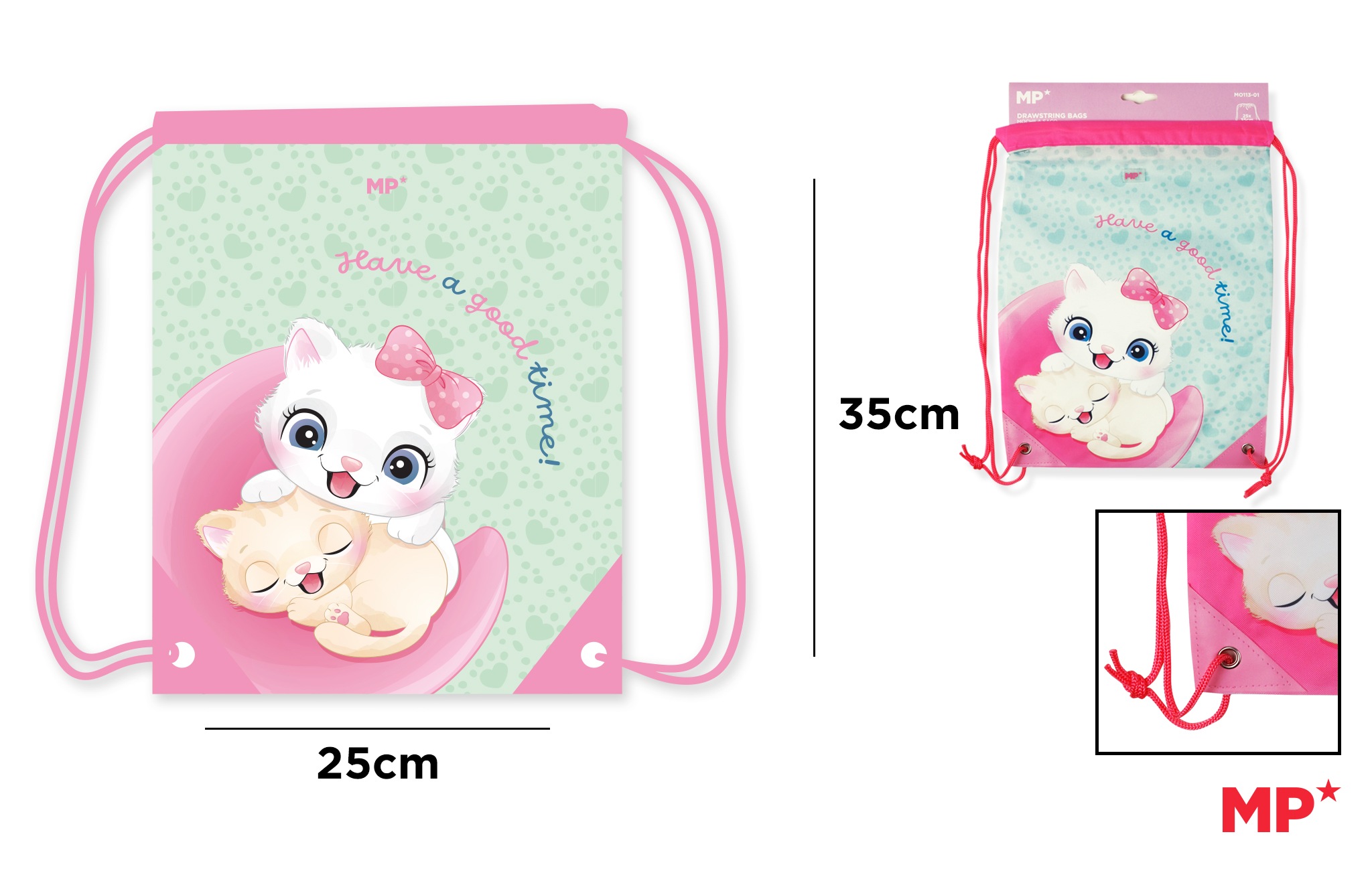 Workoplecak ze wzmocnionymi narożniki i metalowymi pierścieniami zapobiegającymi rozdzieraniu się materiału. Wzór: kotek. Wymiary: 35 x 25cm.