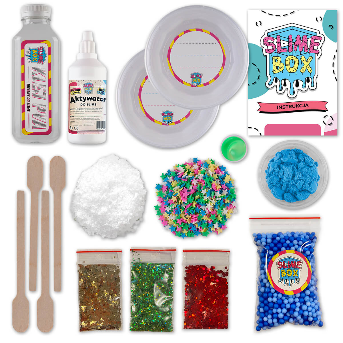 W skład zestawu wchodzą:• Klej PVA (250 ml)- najchętniej kupowany klej do slime w Polsce• Aktywator (100 ml)• Sztuczny śnieg• Fimo gwiazdki• Zestaw trzech świątecznych brokatów• Zimowe kulki styropianowe• Barwnik akrylowy• 2 pojemniki do przechowywania slime (350 ml)• 4 drewniane szpatułki• Instrukcja z przepisami i opisami różnych rodzajów slime