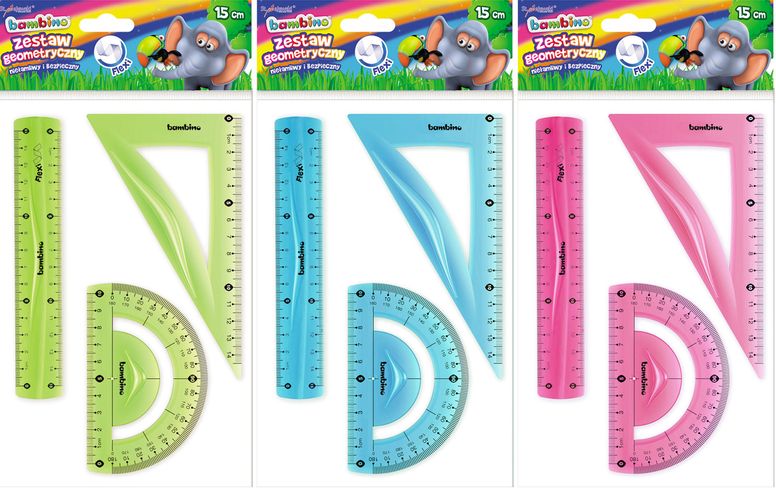 Zestaw przydatny w szkole, w szczególności na zajęciach matematycznych. W skład zestawu wchodzą: linijka, ekierka, kątomierz. Produkty zostały wykonane ze specjalnego materiału odpornego na złamanie.