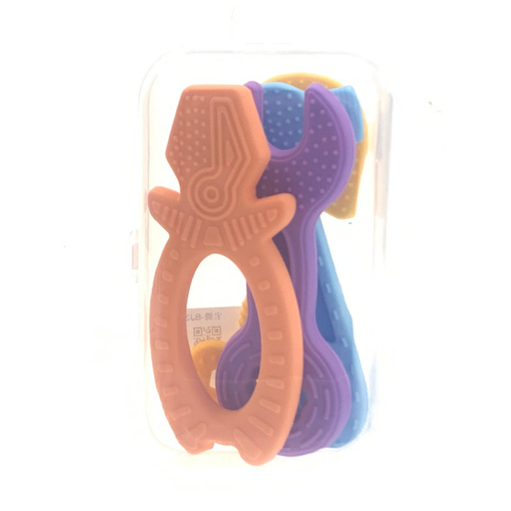 Zestaw czterech gryzaków w kształcie narzędzi.  Wiek: +3m