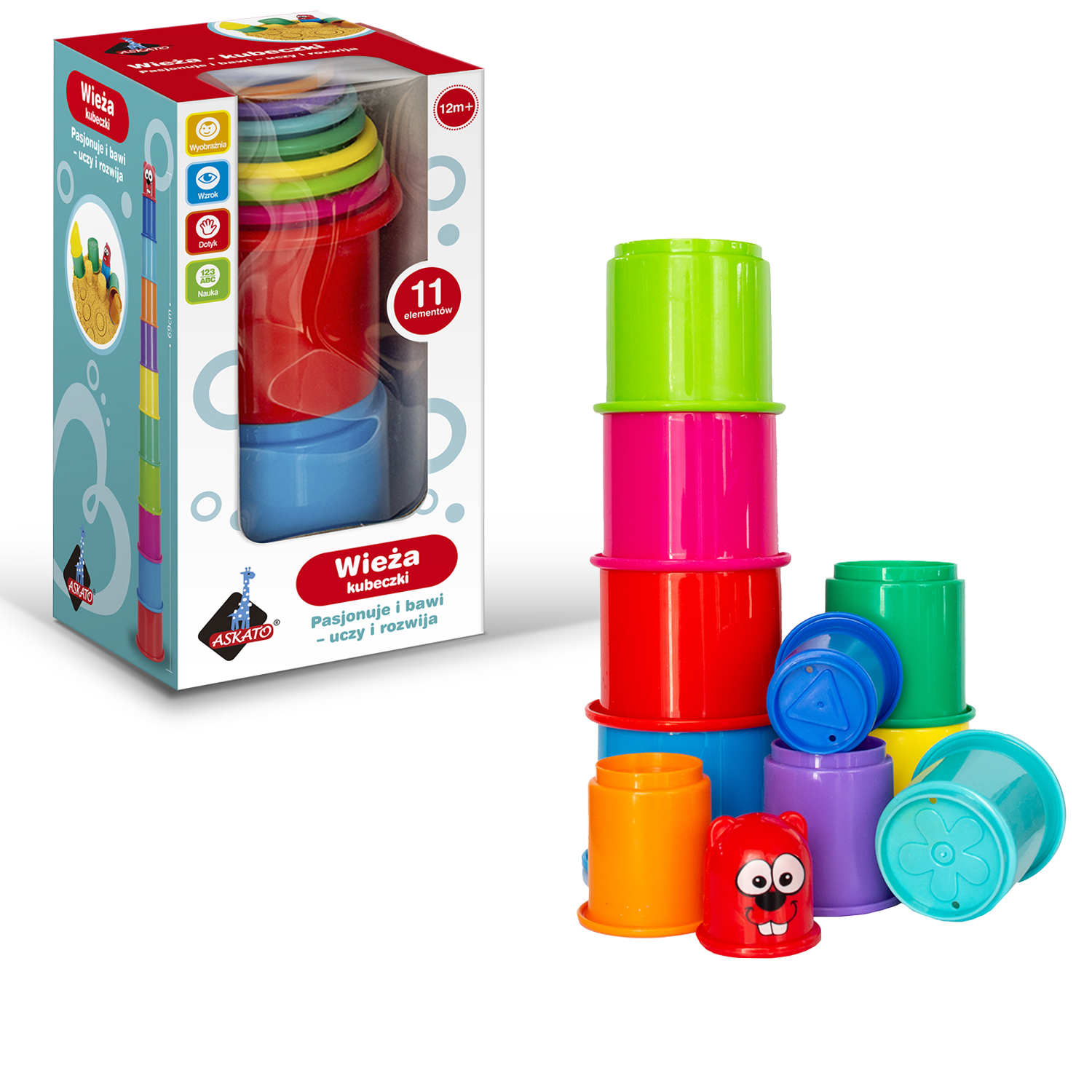 Zestaw 11 kolorowych kubeczków do zabaw w wodzie.Teraz kąpiel będzie jeszcze bardziej przyjemna.Kubeczkami można się także bawić w pokoju i układać z nich wieżę, która ma aż 69 cm.Wiek: +12mWymiary opakowania: 10.5×10.5×20 cm