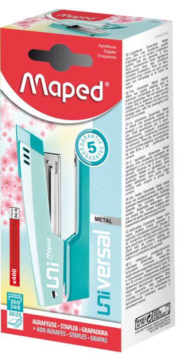 Zszywacz Universal Metal w kolorze pastelowym • krótki magazynek • solidna metalowa konstrukcja • do 25 kartek • zszywanie zamknięte i tapicerskie • otwiera się do 180° • metalowy podajnik na zszywki • głębokość zszywania 61mm• pojemność magazynka 100 zszywek